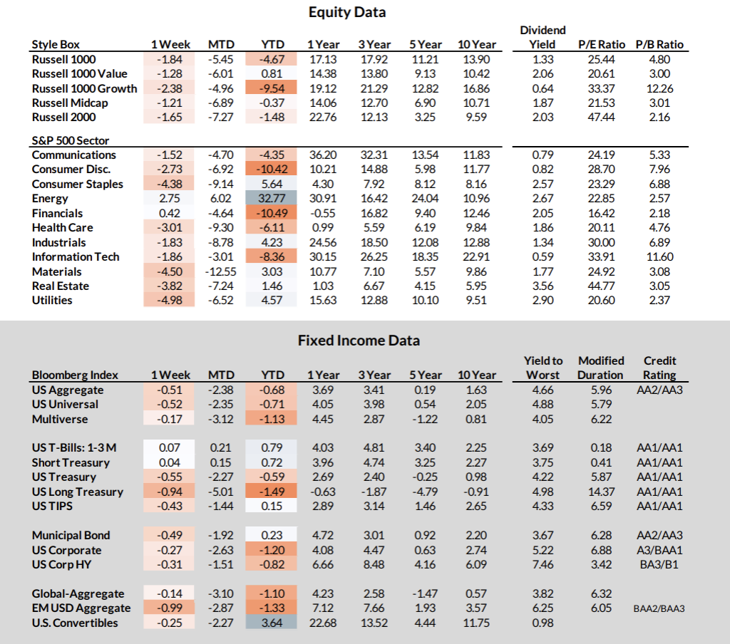 - The S&P 500 declined 1.87%, with broad weakness across sectors