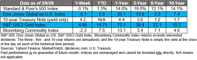 Last week, “Treasuries surged, driving yields down the most in months, as signs of weakness in the U.S. job market helped deepen the retreat from stocks, commodities and cryptocurrencies and boost wagers on Federal Reserve policy easing,” reported Elizabeth Stanton and Miles J. Herszenhorn of Bloomberg. The Standard & Poor’s 500 and Nasdaq Composite Indexes moved lower, while the blue-chip Dow Jones Industrial Average surpassed 50,000 for the first time.