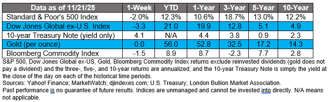 Investors were skittish last week. Share prices jolted higher and lower amid concerns about artificial intelligence (AI) data center spending, upcoming Federal Reserve rate decisions, and the strength of consumer spending, reported Phil Serafino and Natalia Kniazhevich of Bloomberg. These issues will affect the future performance of companies, and investors are trying to anticipate what may be ahead.