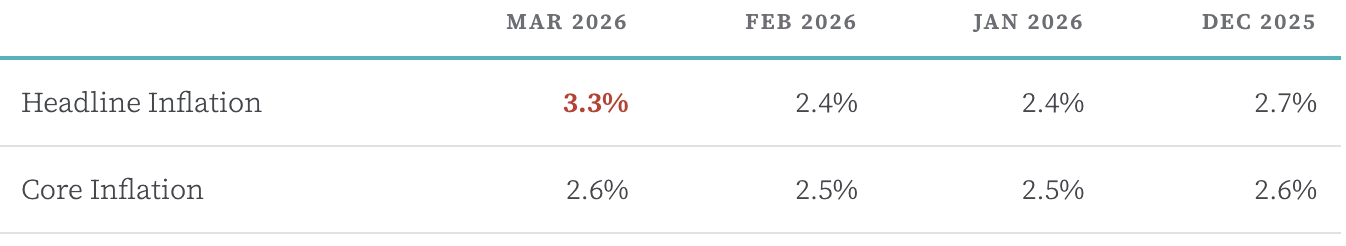 March CPI jumped 0.9% month over month — the largest print in four years — driven almost entirely by a 21% surge in gas prices. Annual headline inflation hit 3.3%. The good news: core inflation (excluding food and energy) held relatively steady at 2.6%, suggesting the war's effect on prices was largely contained to energy — so far.