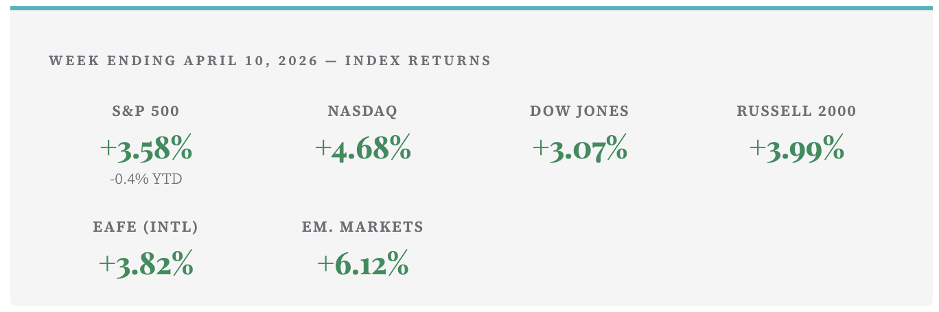 A two-week pause in the US-Iran conflict was the market's sunshine last week. The ceasefire announcement triggered the best single-day gain in nearly a year and erased most of March's drawdown. Small caps and international equities led the way — the Russell 2000 gained nearly 4%, Emerging Markets surged over 6% led by Taiwan and South Korea, and even the VIX retreated from its peak, closing at 19.23.