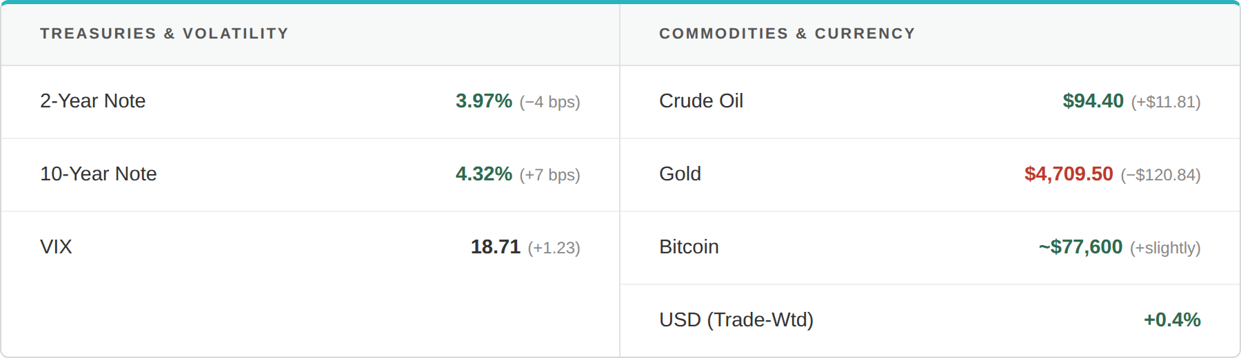 In other markets: the VIX rose 1.23 points to close at 18.71. Gold fell $120.84 to end at $4,709.50. Crude oil surged $11.81 to finish at $94.40 per barrel — a reminder that geopolitical bottlenecks in the Gulf continue to pressure energy supply. The trade-weighted U.S. dollar gained 0.4%. Bitcoin traded up slightly to close around $77,600.
