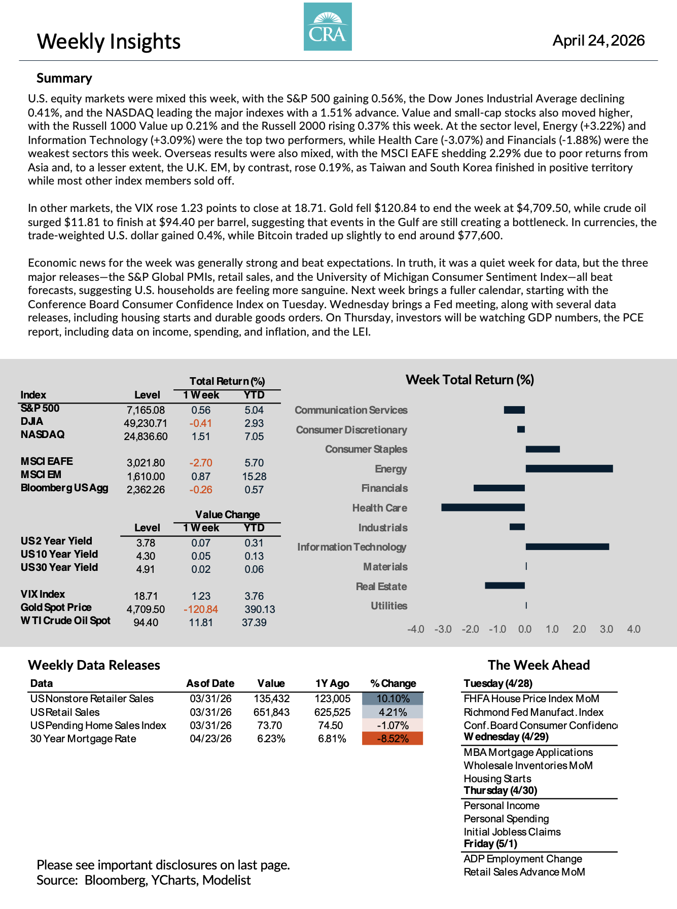 Markets can produce four consecutive weeks of record highs and a 73-year low in consumer confidence at the same time — and both can be true simultaneously. For clients of CRA, this kind of environment is exactly what a coordinated plan is built for. Your income strategy is designed to be independent of what the Nasdaq does in any given week. Your tax exposure and withdrawal sequencing are not tied to sentiment readings. The structure is there so that weeks like this one — where the signal is noisy and the headlines point in opposite directions — require no reaction from you.