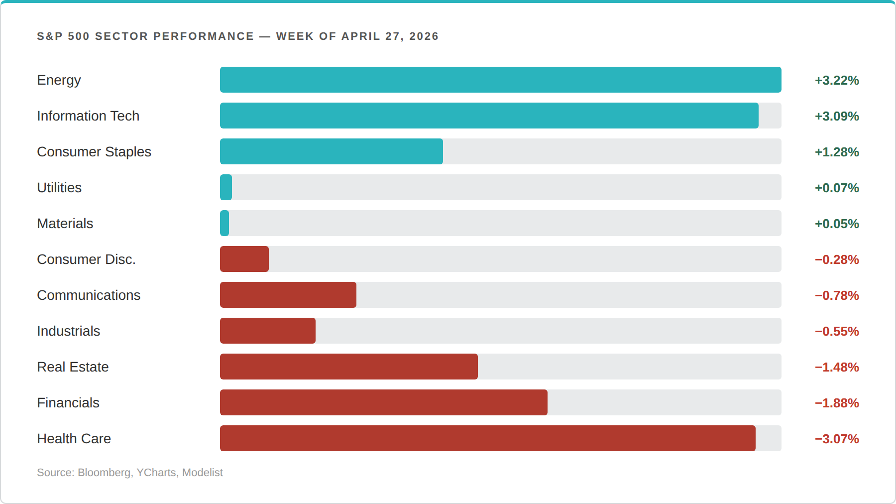 At the sector level, Energy (+3.22%) and Information Technology (+3.09%) were the week's clear leaders. Health Care (-3.07%) and Financials (-1.88%) were the laggards.